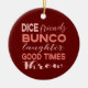 Palavras do estilo tipografia moderna em tons cor-de-rosa acentuadas com um fundo vermelho de férias. Perfeito para troca de ornamentos ou seu jogador Bunco favorito. Dice, amigos, bunco, risos, bons tempos, jogue palavras matemáticas.