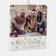 O moderno Elegante Script Snowflake Dourado e Branco Foto Feliz Natal Ornament Cerâmico Feriado. Recursos um) modelo de foto texto "Feliz Natal". O texto de saudação do "Feliz Natal" é escrito em um belo roteiro de fontes brancas com letras brancas e em volta de flocos de neve dourados em fundo branco. Este presente cerâmico de ornamento é bonito para sua família e amigos na época de Natal.