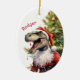 Aqui está um lindo ornamento divertido para aquele filho especial, sobrinho, ou neto que ama dinossauros. A frente apresenta uma imagem de um dinossauro T-Rex com aparência feroz vestido em seu chapéu e terno de Papai noel de inverno. Ele fica em frente a uma árvore de Natal decorada. O nome do seu filho está em vermelho no canto superior esquerdo. A parte de trás do ornamento tem outra imagem do carregando dino um pacote de presentes e tem vários campos de texto para personalização. Faça-o dizer o que quiser!