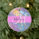 Cor-de-rosa-menina, pêssego e nome do monograma holográfico iridescente aqua e ornamento cerâmico inicial. Seu nome personalizado e monograma são escritos em um elegante roteiro escrito à mão com um fundo rosa. Um aniversário perfeito ou presente de Natal!