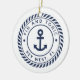 Crie uma única manutenção de barco com este ornamento de fotografia personalizado que inclui o nome do barco e o registro do navio em marinho azul num crachá de corda náutica com uma ilustração de âncora no centro. Adicione uma foto do seu barco ao reverso.