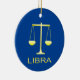 Este adorável ornamento apresenta uma imagem de arte digital de um par de balanças coloridas em ouro com a palavra Libra em texto dourado. Um design divertido para pessoas celebrando um nascer de aniversário entre 23 de setembro e 22 de outubro, sob o signo estelar de Libra. Há texto personalizado no verso para que você possa incluir um nome ou mensagem.