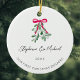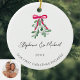 Celebre seu primeiro Natal como um casal engajado com este ornamento cerâmico com foto-na moda. É decorado com uma mistura verde-aquática, fita vermelha e tipografia elegante de script. Facilmente personalizável com seus nomes, data e foto. Use a Ferramenta Design para alterar o tamanho, o estilo ou a cor do texto. Original Watercolor © Michele Davies.