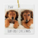 Crie seu próprio Enfeites de natal adorável para seu cachorro primeiro natal. Esta design de estilo minimalista é escrita com uma tipografia de fontes magras em preto e branco. O modelo de foto é configurado para que você adicione uma de suas fotos favoritas, que será exibida no formato paisagem.O texto é editável para cheio e lê "[ano] nosso primeiro natal" na frente com o nome ou nomes do seu animal de estimação no verso. Por favor, procure na minha loja mais ornamentos de natal de primeiro cão.