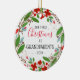 Celebre o seu primeiro natal como avós com este ornamento floral de coroa. Apresentando uma camada aquosa de folhagem verde e flores vermelhas, poeira festiva de ouro falso e letra elegante do roteiro de caligrafia. Basta carregar uma fotografia do seu novo neto e personalizar o texto para tornar este ornamento de xmas único e pessoal para você.