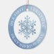 Os primeiros ornamentos de Natal personalizados apresentam flocos de neve brancos decorativos em fundo de aquarela azul de inverno com nomes de casais de um lado, e casais e Sr. e Sra. sobrenome do outro lado, modernos e modernos. Selecione "Clique para personalizar mais" para fazer fotos laterais ou flocos de neve.