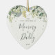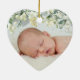 Morangos pintados à mão e caules de eucalipto formam uma fronteira através do topo deste ornamento em forma de coração. Todo o texto é totalmente editável para que você possa mudar facilmente o texto e mudar o estilo/cor/tamanho/posicionamento da fonte. Substitua a foto de modelo no verso por sua. Elementos de coordenação disponíveis.