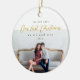 Este ornamento de feriado personalizável apresenta "nosso primeiro Natal como mr e mrs" tipografia com bonito escrita a cores douradas. Os nomes dos casais e o ano estão incluídos, juntamente com uma foto personalizada! Um belo presente de Natal para um casal recém-casado!