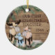 Crie um ornamento comemorativo de fotos de manutenção para o Primeiro Natal de uma família Junto com uma família de veados bonitinhos pintados em azul contra um fundo de madeira rústica, compros de pínus e cones de pínus e ano na frente e uma foto de sangramento de cheio no dorso marcada com compros de pínus e cones de pínus e personalizada com o nome ou nomes da família. Entre em contato com o designer por meio do Zazzle Chat ou makeitaboutyoustore@gmail.com se você quiser que este design seja modificado ou outro produto.