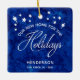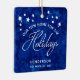 Dê aos seus clientes uma manutenção personalizada do ornamento da árvore de Natal para celebrar sua nova casa este ano. Projetado com texto branco em um fundo texturizado de mármore azul da meia-noite com estrelas. A parte de trás tem uma área para carregar seu logotipo. Um logotipo branco transparente seria maravilhoso. O texto pode ser facilmente alterado para sua própria personalização.