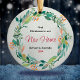 Primeiro Natal bonito em nosso novo ornamento cerâmico de terra. Celebre seu primeiro Natal em sua nova e bela casa com um adorável ornamento de feriado com uma bela coroa e uma tipografia moderna. Personalize-o alterando o ano e o nome da sua família.