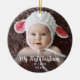 Celebre e comemore o primeiro Natal do seu filho com este ornamento de eterno e precioso. Personalize com uma foto na frente e atrás. Adicione o nome e o ano do seu bebê. Ajuste sua foto conforme necessário. A bela tipografia clássica da escrita branca é sofisticada e na moda, enquanto o texto sans serif é minimalista, simples e limpo. Feliz Natal, Feliz ano novo, Feliz Férias e, mais importante, parabéns!