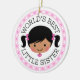 Enfeite bonito com uma pequena caricatura com pele escura e cabelo preto amarrado em rabos com arcos cor-de-rosa. Texto "A melhor irmã do mundo". Em volta está uma borda redonda, rosa, com bolinhas. Também disponível em uma versão para irmãs grandes.