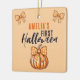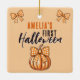 O primeiro Arco de Abóbora de Halloween Ornament cerâmico. Um nome de bebê personalizado em um roteiro, abóbora laranja com arco e arco laranja. Personalize o ornamento com o nome do seu bebê. Uma adorável festa de Halloween.