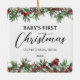 O enfeites de natal tradicional novo de bebês, com uma elegante folhagem botânica para a aquarela, um pinto de neve, o ditado "primeiro natal do bebê", seu nome e o ano.