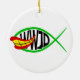 Uma design paródia dos Ichthys (Jesus Fish). O design do peixe Ichthys, amontoado com o Peixe-Coringa de um desenho de quadrinhos. WWJD em texto preto é dentro da pesca, perguntando, "O que o Joker faria?"