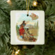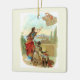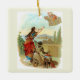 ilustração de pintura vintage para um conto de fadas por hans christian anderson com a filha do sultão em roupa turca vintage, cabelos castanhos longos e pulseiras está ao lado de sua empregada que está preparando uma refeição, estão no topo de uma torre onde a senhora está acenando para um homem no céu que está dentro de um tronco voador acenando para ela e vestido com um vestido laranja.