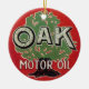 ornamento cerâmico redondo com uma imagem, em ambos os lados, de um logotipo de 1920 para Oak Motor Oil. Veja toda a coleção de ornamentos Roaring 20s em TOUCHES ESPECIAIS | Seção Favoritos para festas.