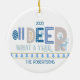 Enfeites de natal personalizado, concebido como um guardião comemorativo para 2020, mas editável para qualquer ano. O trocadilho lê "Oh Veado Que Ano" em tipografia peculiar, decorada com cervo de madeira. O modelo está configurado para personalizar o ano e adicionar seu nome ou nome de família. Ele tem uma paleta colorida de madeira, azul e pedra.