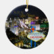 O ornamento da árvore de Natal de Las Vegas mostrado aqui com uma data personalizada comemorada neste ornamento de Natal. Áreas de texto são modelos que podem ser excluídos ou alterados clicando primeiro na caixa azul "editar design" à direita do item. Adicione o ano atual ou o seu aniversário ou primeiro Natal juntos. Design apresenta uma fotografia aérea noturna da famosa "Strip" com marcos icônicos, assim como o famoso neon bem-vindo ao fabuloso sinal de Las Vegas.