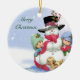 Enfeites de natal com um boneco de neve, crianças e um cachorro brincando com as palavras "Feliz Natal nele.