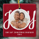 This keepsake First Christmas Engaged photo ornament is decorated with the word JOY in stylish script typography on a red background. Easily customizable.
