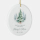 Personalized first Christmas engaged ornaments feature watercolor pine tree and elegant script family name in sage green, modern and simple.