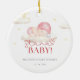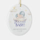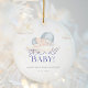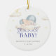 O ornamento cerâmico do chá "Bebê Papai noel" tem um design doce e festivo, com um bebê em um chapéu azul de Papai Noel com nuvens e estrelas moles. Ele usa um roteiro vermelho e tons pastéis, criando uma sensação de feriado aconchegante, perfeita para um chá de fraldas de inverno.