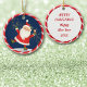 Este adorno bonito mostrando um Papai noel feliz tocando um sino de ouro enquanto patinava em frente a uma cascata de minúsculas estrelas de ouro e prata. A imagem aparece claramente contra o fundo azul escuro, e é moldada com um bonito padrão vermelho e branco de faixa de canas doce. A parte traseira do ornamento tem o mesmo quadro distribuído e vários campos de texto para personalização. Você transforma facilmente o texto do "Feliz ano novo" no nome de uma criança, se preferir. Depende de você!