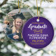 Comemore a conquista do formando com um Enfeites de natal personalizado de graduação em roxo fotográfico e redondo de ouro. Imagem e todo texto são simples de personalizar. Inclua o nome e o grau da escola, parabéns, obrigados, mãe e pai, ou outra mensagem da sua escolha. Design apresenta um fundo roxo, boné de formatura amarelo-ouro, nome personalizado para a tipografia moderna, escola, ano de aula e uma foto da sua escolha, como uma fotografia ou uma imagem de mais velho da cerimônia de início. Faz uma boa ideia de presente de guardas e um complemento elegante para a decoração domiciliar de Xmas. Parabéns ao formando!