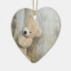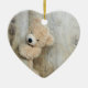 Ornamento com uma fotografia de querido de um urso de pelúcia fofo, em pé por uma parede russa de madeira / pano de fundo.