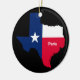 Dois ornamentos laterais que apresentam o contorno do estado do Texas em um deles e a Torre Eiffel de Paris, Texas, no outro.