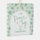 Manuscrito Personalizado Pastel Verde Manuscrito: Peace + Joy Ornament. Design duplo. Mostrada em uma paleta de cores verde e branca, mas todas as cores podem ser editadas. (Apenas certifique-se de editar ambos os lados do ornamento.) Design de branco bonito com escrita à mão e um arco redimensionado. Impressão de pomba espalhada. Personalize o modelo com o nome do ano e da família (ou seu próprio texto personalizado). © Kimbellish, LLC