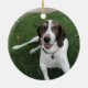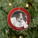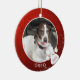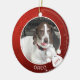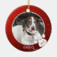 Exiba duas fotos do seu cachorro neste enfeite comemorativo duplo lado com fundo vermelho com flocos de neve e estrelas. Personalizado com nome e ano na frente.