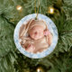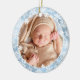 Moderno personalizou o primeiro ornamento cerâmico de Natal que apresenta uma bela coroa de neve, textura azul escura e uma elegante letra manuscrita no verso. Personalize o produto com o nome, o ano e duas das suas fotos favoritas. Este é um presente perfeito para avós ou excelentes - avós.