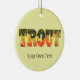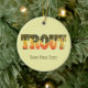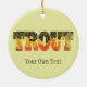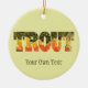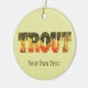 Um belo ornamento de feriado pendurado para a cara ou garota que ama pescar ou que ama ictiologia ou ama truta! A design apresenta a palavra "TROUT" impressa nas lindas cores e padrões da pele da Trout Brook, salvelinus fontinalis. Esta arte de peixe é de uma pintura de aquarela original do Sr. Trout Whiskers. Excelente para casa, escritório, cabana, alojamento, compro ou loja ou qualquer outro lugar onde as pessoas falam truta. Faz um presente único para o seu pescador ou pescador ou ictiólogo ou admirador de peixes favorito. Este mesmo design de peixe também está disponível em centenas de outros artigos de pesca em TroutWhiskers - autocolantes, botões e ímãs; canecas, caixas e chapéus; posters, decalques e ornamentos; artigos para cozinha, casa, cabine e alojamento; capas e capas para celulares; t-shirts, camisolas, capuzes e outras roupas e roupas ... e muito mais, também!