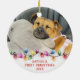 Crie um ornamento de fotos comemorativas comemorativas de manutenção para o Primeiro Natal de um animal de estimação (ou outro texto personalizado) com luzes de Natal coloridas e seu texto personalizado. O design é duplicado no verso com a sua opção de adicionar uma foto diferente. A amostra mostra o PRIMEIRO NATAL do NAME e o Ano. OPÇÕES: A amostra é mostrada no ornamento cerâmico redondo—outros estilos de ornamento estão disponíveis na página de pedidos. ASSISTÊNCIA: Para obter ajuda com a modificação ou personalização do design, alteração de cor, redimensionamento, transferência do design para outro produto ou, se você quiser coordenar itens, entre em contato com o designer ANTES DE PEDIR através da guia MENSAGEM de bate-papo Zazzle abaixo ou envie um email para makeitaboutyoustore@gmail.com.