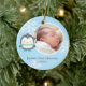 Comemore o primeiro Natal do seu bebê com este ornamento fotográfico que tem um pinguim bonito com cachecol, skates e flocos de neve no fundo. Personalize com o nome do seu filho e o ano nos modelos de texto fornecidos. A cor de fundo pode ser alterada.