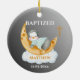 Um ornamento batismo/cristal que apresenta um desenho animado a aquarela pinguim bebê dormindo em uma crescente lua sentada em uma nuvem com um fundo gradiente preto. Um presente adorável para os pais celebrarem seus pequenos batismos ou Christening. Todo o texto pode ser alterado. Personalize o batismo para a comunhão cristã ou sagrada, depois personalize com o nome do bebê e a data. Um presente excelente e guardar o tesouro por anos.