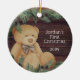 Crie um ornamento comemorativo de fotos de manutenção para o Primeiro Natal de um bebê com um ursinho de pelúcia giro contra o fundo de madeira rústico e pinheiros e cones de pínus e personalizado com o PRIMEIRO NATAL do NAME'S e ano na frente e uma foto de sangramento de cheio no verso marcada com pinheiros e pínus cones. Entre em contato com o designer por meio do Zazzle Chat ou makeitaboutyoustore@gmail.com se você quiser que este design seja modificado ou outro produto.