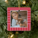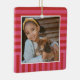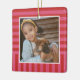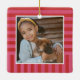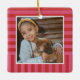 Este Enfeites de natal de uma fotografia giro apresenta uma feliz e um quadro vermelho brilhante, cor-de-rosa e vermelho, juntamente com texto personalizado. Com o mesmo design na frente e atrás, este ornamento de feriado personalizado é uma maneira excelente de lembrar uma memória favorita do ano, um novo bicho de estimação, um novo bebê, uma nova casa e mais. As listras coloridas são festivas e divertidas. Descubra a coordenação de designs riscadas de tendências na coleção de Felizes e faixas brilhantes de Lea Delaveris Design. Este ornamento também faz um presente de excelente!