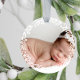Enfeites de natal ao qual você pode adicionar sua própria foto em homenagem ao primeiro Natal do seu bebê. É decorado com uma simples coroa branca com folhas e bagas. Adicione o nome do seu filho e as estatísticas de natalidade nas costas, em branco, contra uma bela sombra de rosa.