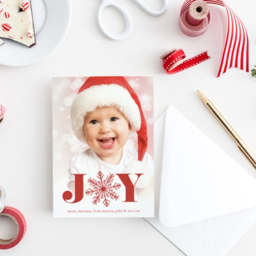 Enfeite festivo e doce mostra sua foto favorita com "JOY" encapotada em cartazes de ameixa. A ilustração do floco de neve substitui o "O". Personalize com o ano abaixo. Ornamento reverte para revelar um padrão festivo de suéter nórdico.