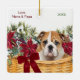 Aqui está um ornamento bonito de Feriado que faria um presente excelente para um neto, filho, filha ou qualquer um. Ambos os lados do ornamento têm uma imagem de um cesto de flores de poinsettia vermelha, flores brancas e pererecas de pínus. No meio está um filhote de cachorro branco e marrom giro. A frente tem um texto verde e vermelho que diz "Feliz Natal, e um nome. As costas têm a sua assinatura e o ano.