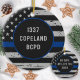 Policial Thin Blue Line Ornament - Bandeira americana em cores da Polícia, design angustiada. Nome e crachá do policial na frente, personalize as costas com o ano. COPYRIGHT © 2020 Judy Burrows, Black Dog Art - Todos Os Direitos Reservados. Policial de Polícia de Linha Azul Thin Policial de Ornamento Cerâmico