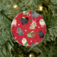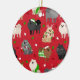 Cães de Natal bonitos em roupas festivas de férias. Pomerânia com creme, preto, bronzeado, cinzas e casacos de chocolate vestem chapéus de Santa, galhadas, suéteres em fundo vermelho com ornamentos espalhados.