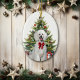 Na frente deste enfeite de Natal está a imagem de um cão Poodle Padrão branco usando um laço vermelho festivo. O cão senta-se em frente a uma árvore de Natal decorada. No verso, o texto vermelho e verde diz "FELIZ NATAL", e há campos de texto adicionais para você personalizar. Faça-o dizer o que você quiser!