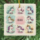 Este ornamento personalizado apresenta um conjunto de rabiscos de unicórnio esboçados em um estilo caprichoso e lúdico com expressões alegres contra fundo de cor pastel.