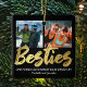 Enfeites de natal personalizado de melhores amigos com um fundo preto moderno que pode ser mudado para qualquer cor, a palavra "besties" em uma fonte falsa de script de folha de ouro, uma citação de amizade, seus nomes e duas fotos quadradas em ambos os lados.