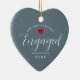 O primeiro Natal Engaged Elegant Custom Heart Cerâmica Ornament é uma ideia perfeita de presente para um casal com grandes planos de casamento. É moderno minimalista desenhado em um ornamento empoeirado em forma de coração azul. Disponível em diferentes formas. O texto é "o nosso primeiro Natal engajado" em letra escrita escrita com letra branca e letra branca, misturada com letra branca simples. Os primeiros nomes dos casais estão na fonte impressão e no ano personalizado em minúsculas. Um pequeno coração vermelho está acima do "noivo". Design está em ambos os lados. Clique na opção personalizar modelo e digite nome e ano.
